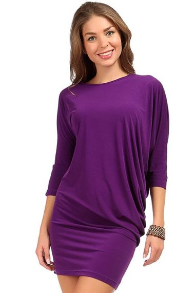 Стильная туника приятного фиолетового цвета из вискозы от личного качества.  Крой облегающий в бедрах и свободный в талии, что позволяет ткани красиво укладывается складками, рукава длиной 2/4.